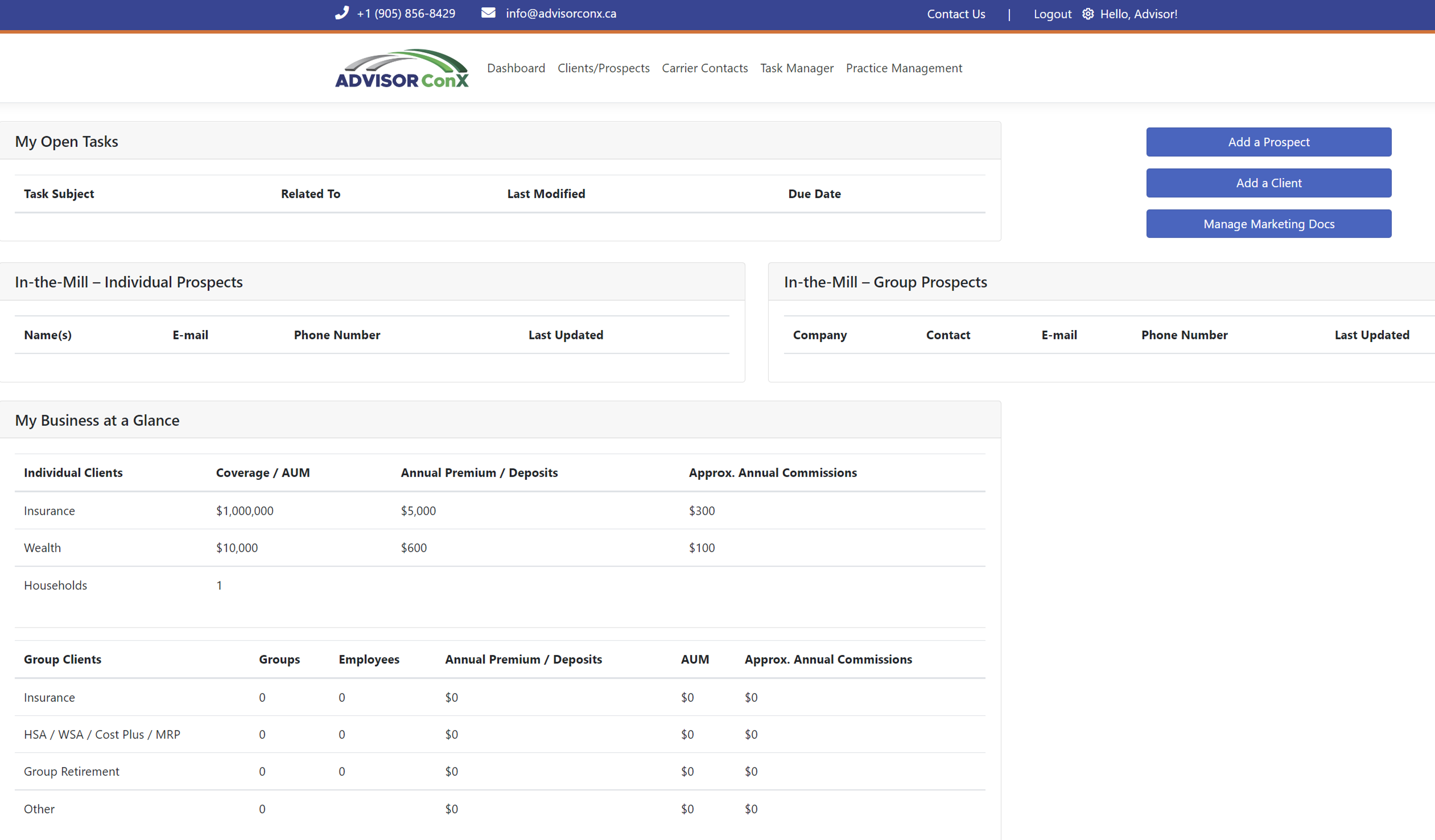 Your business at a glance, including a summary of your AUM, in-force insurance and premium values, total number of clients, information on your group benefits business, including number of plans and employees, and commission snapshots for all of your products |